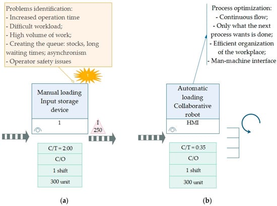 Figure 7 shows the sequence with the critical points in the process mapping (Figure 7a) and the proposed solution for improvement (Figure 7b).