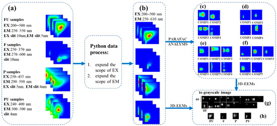 The pre-processed 3D fluorescence data can be used for PARAFAC analysis, while the processed data and the results of the PARAFAC analysis are normalized and converted into grayscale images, as is shown in the following Figure 2.