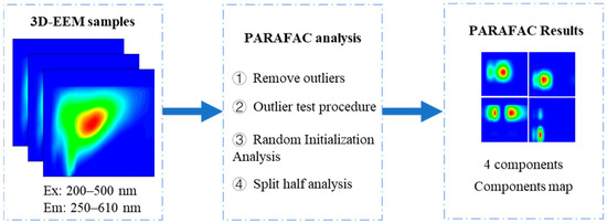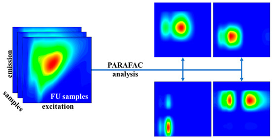 We performed a PARAFAC analysis of the 3D fluorescence data using the drEEM toolbox v0.6. The principle of the PARAFAC analysis method is to decompose the 3D fluorescence data into a set of trilinear terms and a residual array structure [28] (as is shown in the following Figure 3), which is modeled by the process of minimizing the sum of squares of the residuals. Its mathematical expression is as follows: