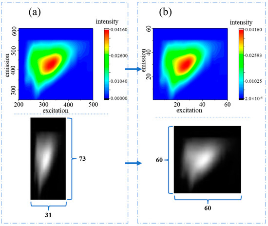 Before training the VGG16 network using 3D-EEMs data, we need to preprocess the 3D-EEMs data to conform to the input and output requirements of the VGG16 network. Through the previous data preprocessing section, the four types of 3D fluorescence datasets have been adjusted to a unified excitation–emission interval, and the Raman normalization operation has been performed on samples. Although this operation was completed, since the excitation interval and emission interval of fluorescence measurement equipment were different during the measurement process of 3D-EEMs, we need to adjust the interval of four types of 3D-EEMs data to be consistent by using interpolation. After interpolation, the size of 3D-EEMs is uniformly transformed to 60 × 60. Figure 5 shows the changes in 3D-EEMs data before and after interpolation. The interpolation method uses bilinear interpolation and the mathematical expression is as follows:
