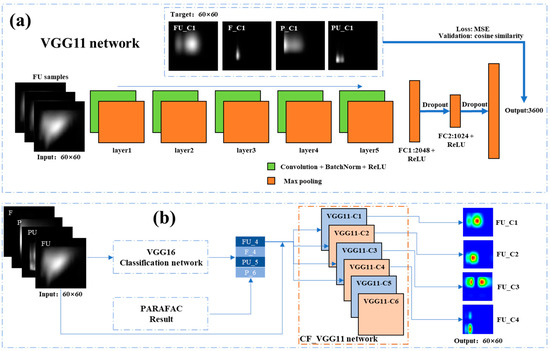 (a) is the single-layer network structure of VGG11; (b) is the structure of the whole fitting network. In (a), the input is a grayscale image of size 60 × 60 and the output is a vector of size 3600. The output vector can be reshaped as a matrix of size 60 × 60. VGG11 network contains 5 convolution-batch norm-pooling layers and 3 fully connected layers. The first and second fully connected layers are followed by a dropout layer, which can prevent the network from overfitting. VGG11 network is trained by the MSE loss function, and the training effect is verified by the cosine similarity. FU_C1 in this figure represents 1st component map of FU, as the other 3 component maps. Each layer represents a group of “convolution-batch norm-relu-Max pooling”. Input is the grayscale image of the network (taking the FU sample as an example), and the target is the label fitted by the convolution network. In (b), four types of 3D-EEMs samples are first classified by the VGG16 classification network. After obtaining the classification results, combined with the component map number from PARAFAC analysis, the classification results and original 3D-EEMs are input into the CF-VGG11 network, and the component maps of 3D-EEMs can be obtained through CF-VGG11 network fitting. Among them, FU_4 indicates that the FU samples contain 4 component maps. VGG11-C1 represents the convolution network used to fit the first component. By inputting each type of 3D-EEMs to VGG11-C1, the first component map of each type of data can be obtained, which is similar to the other 5 subnetworks of CF-VGG11.
