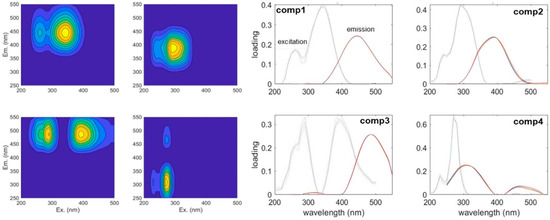 After the analysis of these four types of datasets by PARAFAC analysis, four components (FU), four components (F), five components (PU), and six components (P) were obtained, respectively. PARAFAC analysis is conducted separately for each type of dataset. The process of analysis and component maps are shown in Figure 7.