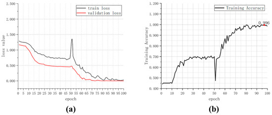 Loss curve and training accuracy curve of VGG16.In (a), when epoch > 80,the training loss and validation loss are both stable. In (b), the training accuracy reaches 99.6% at epoch 97 (the accuracy also reaches 99.6% at epoch 80 and epoch 81).