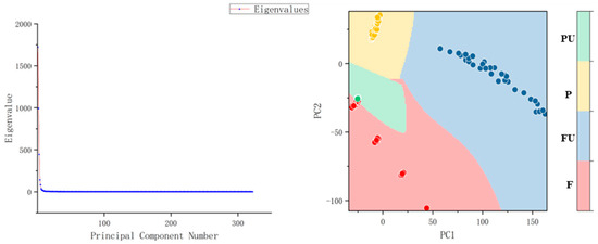 In the PCA experiment, the cumulative of the first three PCs is 87.77%, and the cumulative of the first four PCs is 91.73%. The classification accuracy of SVM is 99.69. The reason for the error is that there are some similar characteristics between PC1 and PC2 of F and PU.