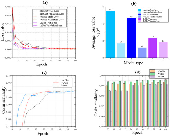 (a,b) show the loss curves, (c,d) show the cosine similarity of model training. In (a,b), the comparison of loss values, the VGG11 model is better than AlexNet model, while the training loss of LeNet is smaller than that of VGG11 model, but the validation loss of VGG11 model is smaller. A smaller loss value means better network performance. Although these 3 models perform well, the VGG11 model has better and more stable performance. (c) shows the change of cosine similarity during model training. VGG11 network shows the best performance of the 3 models. Through the histogram (d) we can see the training change law in the process of 30–40 epochs.