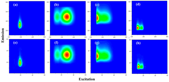 (a–d) are the first component maps of 4 types of 3D-EEMs analyzed by PARAFAC (other component maps are not listed due to limited space), (e–h) are the component maps obtained by CF-VGG11 fitting. In (a–d), the abscissa is the excitation wavelength, the ordinate is the emission wavelength, and the fluorescence intensity is the fluorescence intensity after Raman normalization. In (e–h), the abscissa = (excitation-200)/5 and the ordinate is (emission-250)/6.