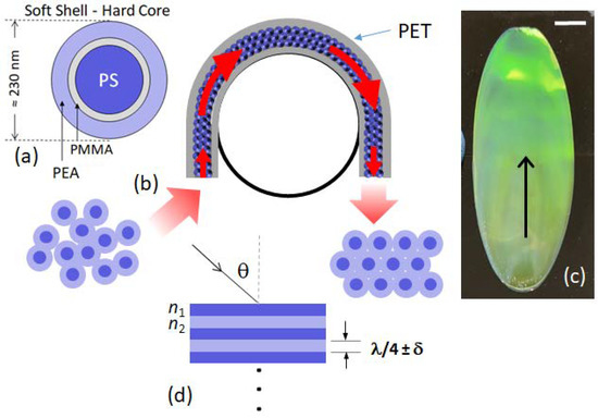 - Li, H.T.; Wu, P.; Zhao, G.W.; Guo, J.; Wang, C.C. Fabrication of industrial-level polymer photonic crystal films at ambient temperature Based on uniform core/shell colloidal particles. J. Colloid Interface Sci. 2021, 584, 145–153. [Google Scholar] [CrossRef]