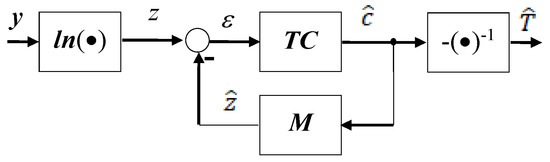 As a result of the above substitutions, the problem of estimating T(t) becomes the problem of tracking the variable c(t) with an observer S0 that includes the model (5). The structure in Figure 2, in which M is the model (5) rewritten as (6), and TC is a tracking controller of z(t), can perform the tracking of T(t). The input block performs the operation (3), and the output block performs the operation (7), opposite to the one in (4):