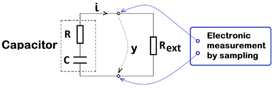 The process we refer to occurs in the circuit in Figure 9 and consists of discharging a real capacitor through an ideal resistor Rext. In the R-C model used for the capacitor, R represents the ESR. The voltage at the terminals of the capacitor is y, and the discharging current i.