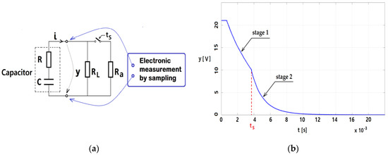 The above-described situation can be implemented with a good approximation using the discharging scheme in two stages, as shown in Figure 10a. At ts, at the end of the first stage, the switch closes, determining the voltage variation y(t) presented in Figure 10b. This is due to the variation in the equivalent resistance Rext with its different values, Rext1 and Rext2, according to Equation (33):