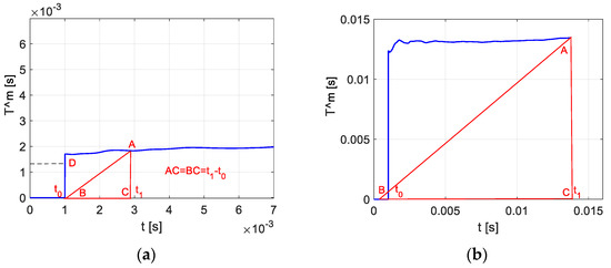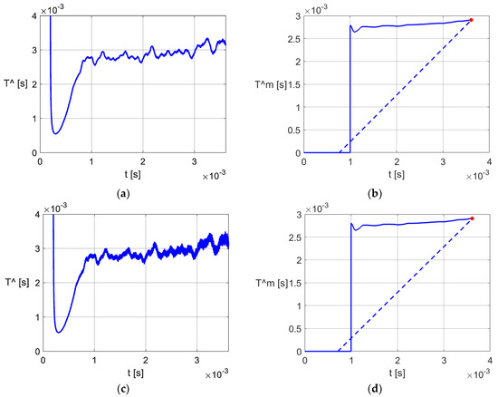 Figure 15b,d shows, using the bisector method, the equivalent values and . The calculated values correspond to t1 = 3.6087⋅10−3 s, and t1 = 3.6137⋅10−3 s. Therefore, we consider that: