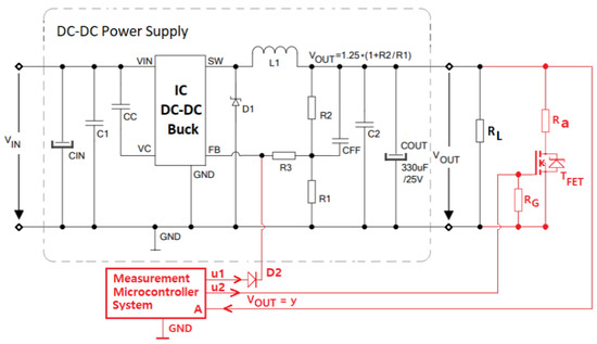The discrete-time PO is further used to determine the equivalent parameters of the COUT electrolytic capacitor of the DC–DC buck converter in Figure 12 [31]. The power supply is realized with a dedicated integrated circuit. At the input of the source, the unstabilized voltage VIN is used, and at the output, the stabilized voltage VOUT (VOUT < VIN) is applied to load RL. The elements and connections represented in red were added to produce a non-invasive two-stage discharge. The signal u1, applied by an ATMEGA 328 microcontroller, on the FB pin of the integrated circuit (IC DC–DC Buck) via diode D2, stops the DC–DC power supply and triggers the first stage of the discharging process. The microcontroller also controls by u2 signal the TFET transistor to connect at the proper moment the additional resistor Ra. The signal applied to input A is used to monitor the voltage VOUT = y, determining by its level the moment when the second stage must be initiated. For applications, the value of COUT can be adopted in a wide range. Thus, compared with the capacitor of 330 µF in Figure 12, we used two capacitors of 100 µF and 470 µF. For the values of R1, R2, C2 and CFF we used 270 Ω, 4.05 kΩ, 100 nF and 10 nF, respectively.