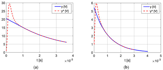 Figure 14 shows the discharging curve stages of the 100 μF capacitor, together with the estimates calculated with the discrete-time PO. Figure 14a corresponds to the first stage, while Figure 14b to the second stage. Figure 15 illustrates for the first stage the variations and calculated in two processing hypotheses. Thus, Figure 15a,b corresponds to the processing of the measured voltage values filtered with the 51-point moving average filter (38), while Figure 15c,d corresponds to unfiltered data processing.