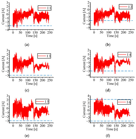 (a–h) lithium battery current change diagram, the blue dotted line represents the normal operating current range. (Multi-layer equalisation circuits and equalisation strategies in this paper).