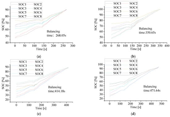 To demonstrate the adaptability of the proposed multi-layer balancing strategy, the following four sets of tests were performed under the external current used above, and the initial SOC of the four sets of batteries is shown below: