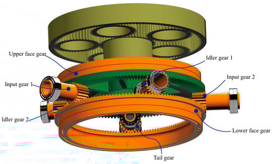 Table 2. The input torque of the single input gear was 1256 Nm and the output torque of the tail transmission was 251 Nm. The elastic modulus of the gear material was E = 206 GPa and the Poisson’s ratio was