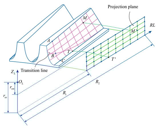 OL is the intersection of the cutting tool axis with the face gear axis. Finally, the grid planning of the projection plane was carried out, the mapping relationship between the grid points and the tooth surface coordinates was established and the grid parameters were obtained by solving the nonlinear equations.