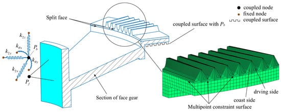 33]. Accordingly, the coupled elastic support and mesh non-coordinated face gear model was established based on the multi-point constraint method, as shown in