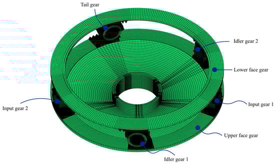 Figure 1. It consisted of two face gears and five pinions, and the face gears were coaxially placed face-to-face. First, according to the principle of gear meshing and the method of rotating projection, the mapping model of tooth surface meshing was established, and the nonlinear equations containing tooth surface parameters were formed. The parametric segmentation method was used to provide initial values for the Newton–Raphson algorithm, and the digital tooth surface was calculated to provide tooth surface data for parametric modeling. Then, the spring element was used to simulate the support stiffness, and the coupled elastic support system model was established based on the multi-point constraint method. Lastly, the influence of the elastic support stiffness parameters, face gear installation errors, and backlashes on the load sharing and contact characteristics were evaluated using the single factor analysis method.