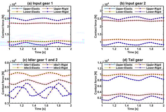 Figure 7, respectively. From the figure, it can be seen that when considering elastic support, the fluctuation range of the meshing force was small, and the numerical value of the contact force was quite different from that of the rigid support. Therefore, it was necessary to consider elastic support when analyzing the load-sharing characteristics of the system.