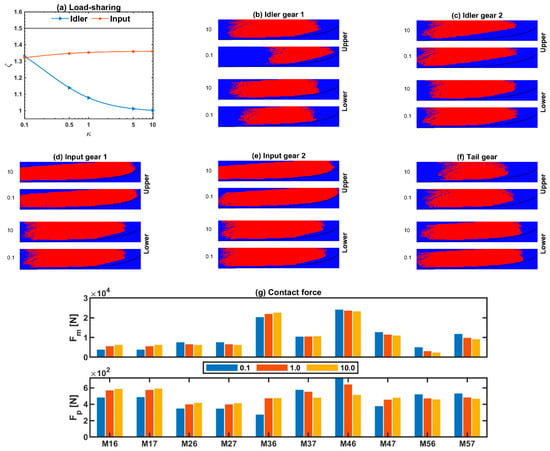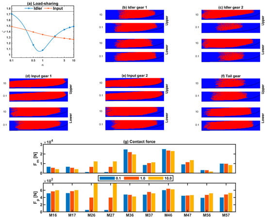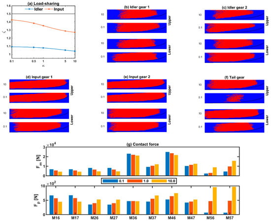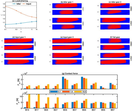 Figure 10b–g, with the increase in the stiffness factor, the contact area of the tail gear pair increased significantly such that the tail gear bore more load. This also reduced the maximum load transmitted in the idler gear and the input gear meshing pair. Therefore, the large tail support stiffness was more conducive to a balanced bearing.