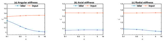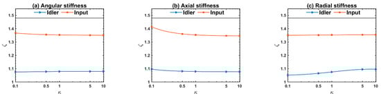 Figure 14. In these figures, subfigures (a), (b), and (c) show the effects of the angular, axial, and radial stiffness on the load sharing, respectively. It can be seen that the angular stiffness of the upper face gear had a great impact on the load sharing of the idler gear. When the stiffness factor exceeded 1, the influence on load sharing gradually decreased.