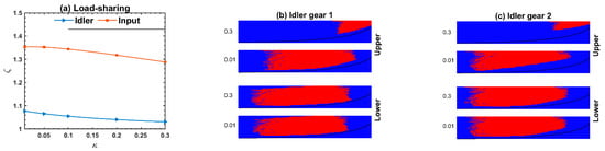 Figure 9a that increasing the support stiffness of the input gear significantly increased the load-sharing coefficient of the idler gear and the input gear, where the load-sharing coefficient of the input gear rapidly increased from 1.07 to 1.60. Furthermore, both load-sharing coefficients varied quickly in the range of (0.1, 1). Similar to