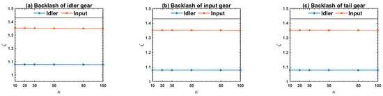 Figure 19 shows that the backlash had little effect on the load-sharing coefficient. Taking the idler gear backlash as an example, when the backlash values were 10 µm and 100 µm, the load-sharing coefficients of the idler gear were 1.079 and 1.078, respectively, which decreased slightly.