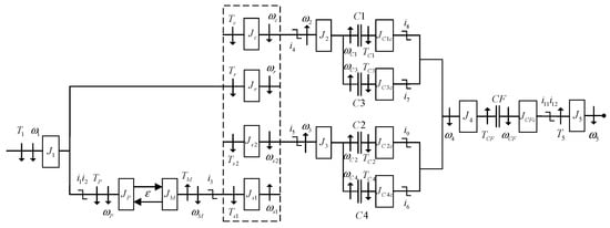 where  is lumped inertia, kg·m2;  is angular velocity, rad/s;  is torque, Nm; are gear ratios; the subscripts C1, C2, C3, C4, and CF denote the clutches; and the subscripts P and M denote the pump and motor, respectively.