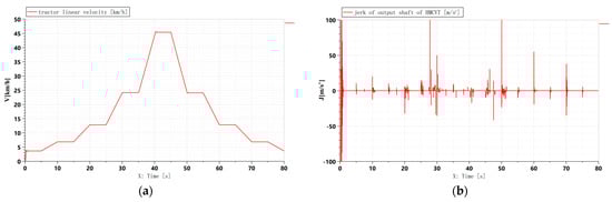 Simulation results of the continuous shift process of HMCVT. (a) Simulation result of the tractor linear velocity; (b) Simulation result of the jerk of the output shaft.