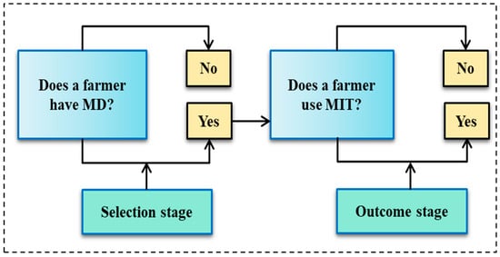 The dependent variables can be divided into two different sections. The first section is the MDs adoption (selection stage), which is the binary result of deciding whether the farmer adopts MDs that support the internet (y1 = 1; otherwise, y1 = 0); the second section (outcome stage) is the binary result, which determines whether the farmer adopt MIT (y2 = 1; otherwise y2 = 0). The probit method is a common econometric model which contains dependent variables and obtains binary results through maximum probability assessment [74]. By estimation, the two probit models for MDs adoption and MIT disregard the apparent association between the two. The bivariate probit method considers this association, which expands the probit technique [75]. However, the bivariate probit approach does not fully consider the predictable association between MDs adoption and MIT. More specifically, the MDs’ adoption ultimately determines the probability of adoption of the MIT. Therefore, the selection stage result can only be observed if the farmers adopt the MDs. Hence, selection of sample bias may appear if the second result observation is not a random sample from the population [76].