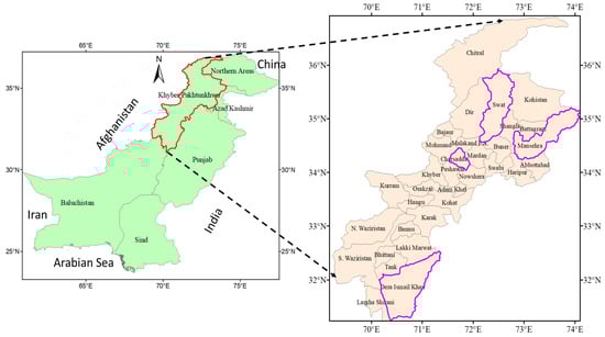 Map of the study area. The selected four district’s boundaries are shown in pink color [37].
