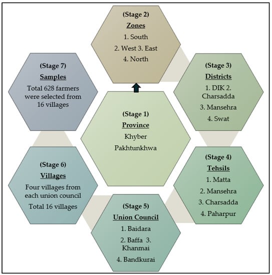 The study was conducted in KPK Province, Pakistan, from January to March 2021. In total, 650 questionnaires were distributed to the wheat farmers: a total of 628 questionnaires were considered fairly reliable to collect the data needed for this study, and 22 questionnaires were not considered in this study because they were not complete. This study used multistage random sampling techniques to collect the essential information from wheat farmers face to face (hard copy questionnaire distributed to the farmers in person). In order to understand the first stage of the MIT adoption by wheat farmers in KPK province, data were collected from four districts, namely, Dera Ismail Khan, Charsadda, Mansehra, and Swat, depending upon the share of agriculture production in these areas (Figure 3 and Figure 4).