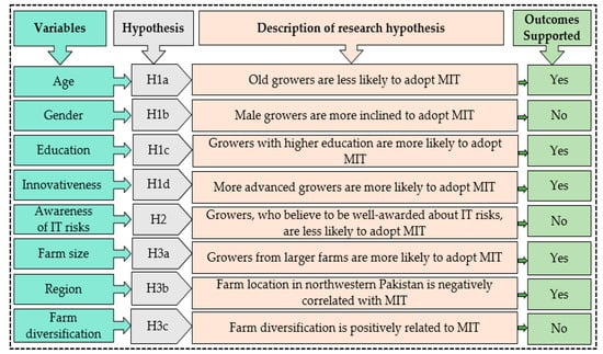 Figure 5 summarizes the hypothesis test outcomes. H1a indicates the age impact on the adoption of MIT, and the coefficient has a negative sign in statistics, indicating that, ceteris paribus, the older age is negatively correlated with the MIT adoption. Therefore, H1a could not be rejected. This outcome is consistent with the aforementioned research on MIT and the internet in sustainable agriculture development. Young farmers may be more interested in the use of innovative technologies, as [83,84] also pointed out. In addition, skills used in conjunction with information technology and MDs are generally well among young farmers [85]. It is consistent with the previous findings. For example, Woodburn et al. [86] found that older farmers have less computer and smartphones experience. However, young farmers have less agricultural experience [87]. Young farmers may use MIT as a source of additional knowledge for decision making. In short, young farmers are more likely to adopt MIT.