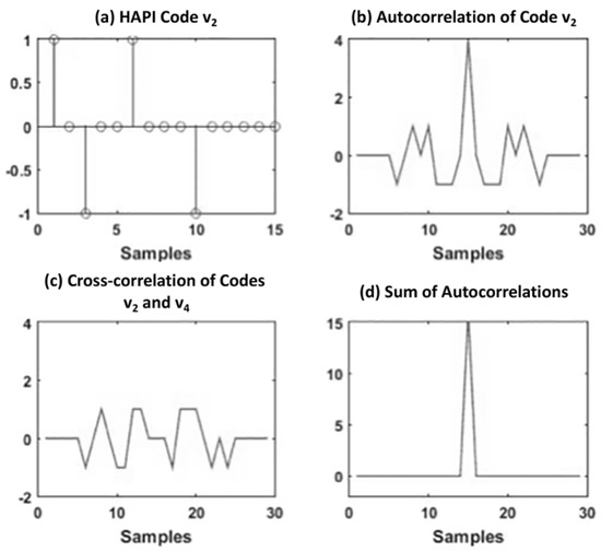 (a) Temporal representation of code , (b) autocorrelation of code , (c) cross-correlation of codes and , and (d) sum of all the autocorrelations of codes through .