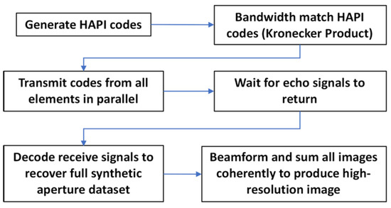 Figure 3 below shows the process flow diagram of the system used for imaging. Order 128 HAPI codes are first generated according to the algorithm described above. The bandwidth of the codes is then matched to the bandwidth of the transducer by performing a Kronecker product with a sequence of 10 ones. This ensures that a coded excitation pulse width (10 ns) is half the center frequency period (20 ns for 5 MHz). The bandwidth-matched codes are then transmitted in parallel from each transmit element (128 elements). Then, each HAPI code is cross-correlated with the receive signals from the receive elements to obtain each transmit–receive combination. The decoded transmit–receive aperture data are then beamformed to produce 128 low-resolution images. Finally, the images are then combined to produce one high-resolution image.