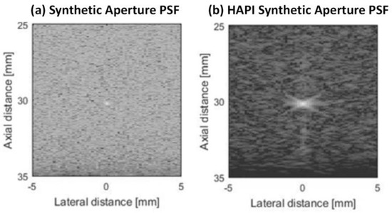 When imaging with a linear array, HAPI synthetic aperture produced a much higher SNR than traditional synthetic aperture or coherent plane wave compounding. Theoretically, there should be a maximum SNR increase of dB when comparing 128-element traditional synthetic aperture with HAPI synthetic aperture. The simulation results from Table 2 show that there is a difference in SNR between those two imaging methods of 36.4 dB. This is very close to the theoretical maximum. However, this maximum is only achieved when a Kronecker product is applied to the HAPI code in order to match the bandwidth with the transducer. When this adjustment is not applied, there is only an increase in SNR of 12.85 dB. This result shows the importance of matching the bandwidth so that one can obtain the maximum SNR increase theoretically possible. The difference in SNR and the impact of noise between traditional SA and HAPI-SA can be visually seen in the point spread functions (Figure 4). It is clear that there is much more noise present in traditional SA with 128 transmit events (Figure 4a), compared to HAPI-SA with one transmit event (Figure 4b).
