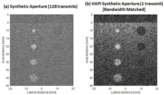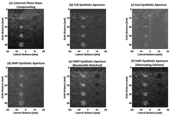 Figure 5 below compares the simulated images of the scattering phantom for all the imaging methods: (a) coherent plane wave compounding (b) synthetic aperture imaging, (c) fast synthetic aperture imaging, (d) HAPI synthetic aperture imaging without bandwidth matching, (e) HAPI synthetic aperture imaging with bandwidth matching, and (f) HAPI synthetic aperture with the alternating scheme. We can visually see that HAPI-SA imaging with bandwidth matching (Figure 5e) produces the best image in the context of noise. When the bandwidth is not matched (Figure 5d), the image quality suffers. We can also see how the alternating scheme (Figure 5f) of transmitting on every other element, and receiving on the rest, produces an image that is better than traditional synthetic aperture but worse than the full HAPI-SA imaging method that transmits and receives on all elements. This is because only half the synthetic transmit–receive aperture data are obtained in the alternating scheme. The full aperture data can be obtained by imaging with the alternating scheme twice, and switching the elements used for transmit and receive for each transmit event.