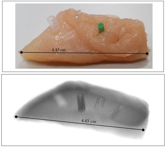 For the implementation of the idea of blood vessels visualization in soft tissue using the contrast that would be created by the presence of air in the vascular cavities, chicken flesh was used as a phantom in which cylindrical tubes/capillaries of various diameters made of different materials were placed. These were two tubes (silicone), a glass capillary with sealed ends, and a plastic straw (bioplastic PLA). This phantom, depicted in Figure 1, was then scanned with the Phywe XR 4.0 (PHYWE Systeme GmbH & Co. KG, Göttingen, Germany) experimental setup.