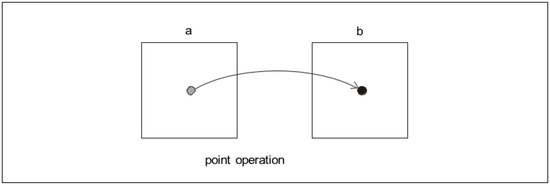 In the field of digital image data processing (digital images), various point operators or functions are very often used to perform single-point assignment, or transform the value of an image point (pixel) from an input image (labeled a) at a given position (x, y) to another value within the output image (labeled b), but at the same position (x, y). In general, this situation is indicated in Figure 2.