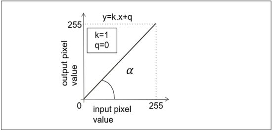 Let us consider an experiment where we multiply the pixel values in the input image by 1. If we consider the usual input dynamic range of grayscale digital images (i.e., 0 to 255, where 0 represents the black level and 255 represents the white level), then the output image will produce a result that is identical to the values in the input image. For example, an input value of 10 would be multiplied by 1 and the result would also be 10 and this would continue for all pixel values in all positions. This then results in a simple linear function that can be represented as a straight line at a 45° angle and passing through the origin of the coordinates, or it is a simple copy of the input image. Such an example can also be expressed very simply in mathematical notation, namely the slope equation of the straight line as reported in Figure 3.