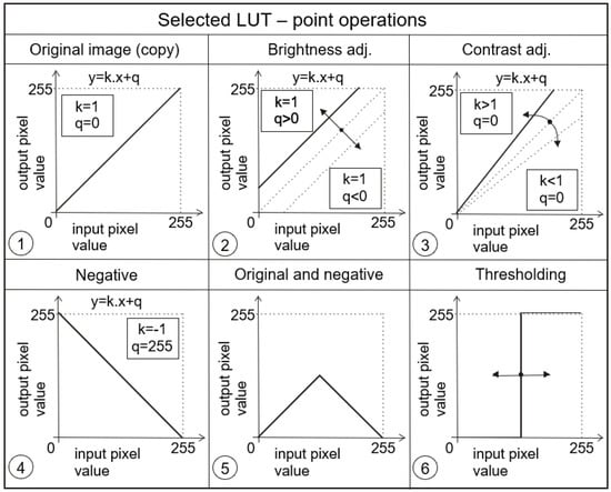 With this defined operator, we can easily adjust various changes to image parameters such as brightness and contrast, both when we need to highlight selected gray levels or when we need to suppress them. Examples of different transfer functions are shown in Figure 4 and Figure 5.