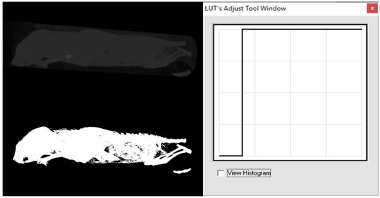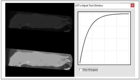 There is a very important process in CT and µCT imaging, that is the actual conversion of the attenuation of the passing X-rays to the grey level. Based on the physiological properties of human vision, 256 gray levels are very often used. The range of so-called Hounsfield units (HU) is typically in the range −1024 to +3071, which is 4096 values, and this is a much larger dynamic range than the 256 gray level values. For this reason, only the so-called windows on a given tissue (limited HU range), which has a width of 256 values or greater, need to be displayed. Thus, it is never possible to see all tissues at once, see soft tissue window, bone window, etc. Realistically, this situation is often implemented by a transfer function that has HU values on the x-axis and gray level values from 0 to 255 on the vertical axis. The situation is also depicted in Figure 8, which is an example of this situation in NRecon software [15].