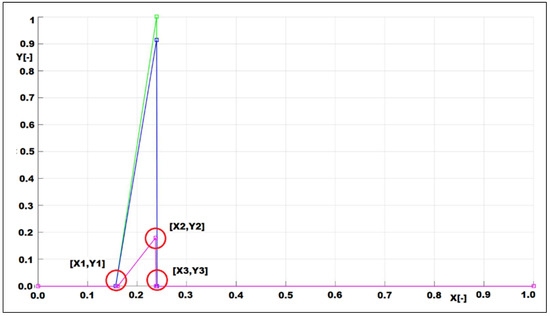 In Figure 10, we can see example of the opacity LUT with marked points, i.e., [X1,Y1], [X2,Y2], and [X3,Y3] whereby coordinate Y1 = 0 and Y3 = 0. These points form a homogenous triangle that enables simplified computation of the centroid.