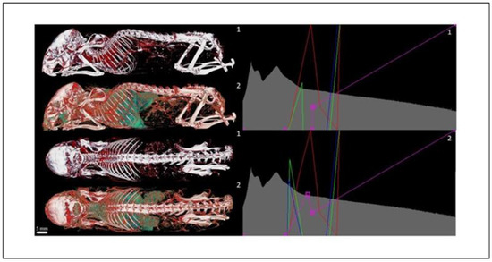 Four chicken samples also contained the contrast agent Aurovist, consisting of 15 nm gold nanoparticles. Specifically, there were two scans at 10 days of age and another two at 12 days of age; unfortunately, no internal (soft) anatomical structures could be identified in this case either. This may have been due to the short age of the chicks, which may not have developed these structures properly yet. A second explanation could be that very low amount of Aurovist contrast agent was injected into the sample.