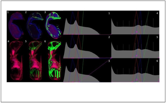 A total of 53 transfer functions (LUTs) were designed, 42 of which were validated and optimized to emphasize the soft tissues of selected biological samples from µCT (mouse, rat, rabbit) using selected contrast agents (Aurovist, Omnipaque, KI in the ethanol solution, Mercox). The remaining 11 transfer functions could not be verified due to the absence of contrast in soft tissue samples from chickens. In total, 18 images and transfer functions are included within this text.