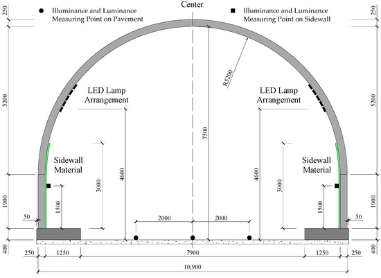 The use of LED lighting can save energy consumption on the basis of ensuring the tunnel lighting requirements, and the existing statistical data show that the application of LED lamps in the tunnel can achieve energy saving of more than 30% compared with other types of illumination lamps [23,24,25]. For the LED lighting environment, the lighting specifications of the “Guide for the Lighting of Road Tunnels and Underpasses (CIE 88 2004)” [26] and “Guidelines for Design of Lighting of Highway Tunnels (JTG/T D70/2-01-2014)” [27] specify the road surface luminance in tunnels and demand that the average luminance of the tunnel sidewalls, up to at least a height of 2 m, must be at least 60% of the average road surface luminance at the relevant location. In the existing tunnel lighting design, the lighting calculation and analysis focus on the setting of road surface luminance. As for the sidewall luminance, it simply follows the principle of no less than 60% of the road luminance. In fact, the tunnel sidewall is one of the important components in tunnel lighting environment; however, the impact of the improvement of sidewall brightness on the LED lighting environment in the tunnel has not attracted enough attention. For example, when the sidewall luminance is 80% of the road surface luminance, or even greater than the road luminance, what impact will it have on the lighting environment in the tunnel and the visual characteristics of human eyes? In this study, experimental research was carried out in a tunnel when the tunnel sidewalls were decorated with two different types of materials and illuminated by LED lamps with five different color temperatures, to analyze the impact of improvement of tunnel sidewall brightness on the lighting environment and visual characteristics of human eyes.