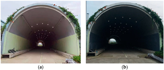 The test tunnel is 160 m long, with a clear width of 10.4 m, a clear height of 7.5 m and a wall thickness of 0.25 m. The cross-section dimensions are shown in Figure 1. In the area of 4.6–5.4 m away from the road surface, five rows of LED lamps were installed, and the vertical interval between each row was 0.2 m. In each row, the LED lamps were symmetrically arranged on both sides of the tunnel. The longitudinal interval between two adjacent LED lamps was 10.5 m, and the distance from the first lamp to the tunnel entrance is 12.5 m. The color temperatures of the five rows of lamps from low position to high position are 2500 K, 3500 K, 4500 K, 5500 K and 6500 K, respectively. Two different decorative materials were decorated on both sides of the tunnel sidewalls within the range of 3 m, as shown in Figure 1 and Figure 2. Firstly, the energy-storage and luminescent coating with high reflectance was painted on the tunnel sidewalls, and the indexes of lighting environment and visual characteristics of human eyes in the tunnel were tested. The energy-storage and luminescent coating is a modified rare-earth aluminate material and using energy-storage and luminescent coating for auxiliary lighting in tunnel can increase the brightness because of its high reflection; moreover, the energy-storage and luminescent coating can release the stored energy in the form of light for emergency lighting [28,29]. Then, the energy-storage and luminescent coating was covered with gray cloth, and the same indexes were tested. The appearance and interior decoration of the tunnel decorated with energy-storage and luminescent coating and gray cloth are shown in Figure 2.