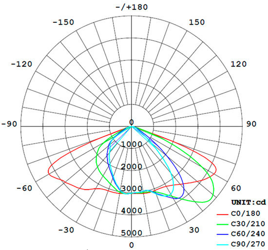 The electric power of LED lamps in the tunnel was taken as the control index, and two different electric powers were selected. The luminous efficiency of the LED lamps is 108 lm/W, and the light distribution curve is shown in Figure 3. Combined with the lighting conditions of the test tunnel, two lighting states were set. For the tunnel in which the sidewalls were decorated with energy-storage and luminescent coating, the LED lamps with five different color temperatures were turned on at electric power of 10 W sequentially; then, the LED lamps with five different color temperatures were turned on at electric power of 18 W sequentially, i.e., a total of ten lighting environments. For the tunnel in which the sidewalls were decorated with gray cloth, the power control of LED lamps was the same as that decorated with energy-storage and luminescent coating, which will not be repeated here. The luminance, illuminance, spectral distribution, S/P value and human visual characteristics were tested in the twenty lighting environments to provide a basis for the analysis in this study.