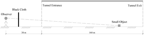 The test for human visual characteristics includes two parts: the visible distance test for a small object in the tunnel and the dynamic change of the driver’s eye pupil diameter during driving in the tunnel. When testing the visible distance for the small object, three observers with normal sight and without color blindness, color weakness, or other eye diseases stood outside the tunnel with a distance of 38 m away from the tunnel entrance and observed the small object randomly placed in the tunnel, as shown in Figure 5. The small object is a gray cube with a size of 10 cm × 10 cm × 10 cm and a surface reflectivity of 0.2 [19]. The observer firstly stood outside the tunnel and a black cloth was placed in front of him; then, the black cloth was removed, and the observer was requested to recognize the small object randomly placed on the pavement of the tunnel for 0.1 s [19,30]. The observer was asked the following three questions: (1) Is there any object? (2) Where is the position of the object on the pavement? and (3) What is the shape and color of the object? If the three questions were answered correctly, it was considered that the observer can recognize the small object [19]. During the test, the distance between the small object and the observer was repeatedly adjusted until the observer cannot recognize the small object, and then recorded the maximum visible distance between the observer and the small object.